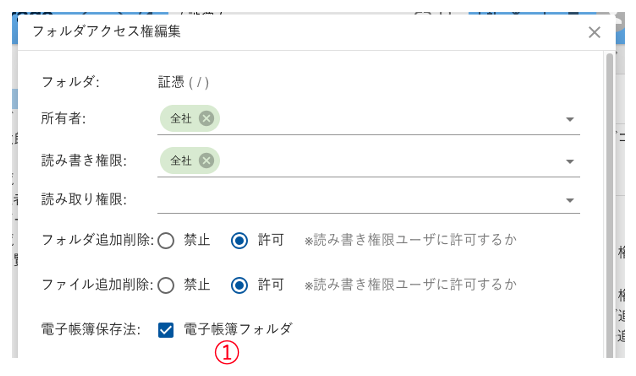 電子帳簿保存機能を利用する場合は、フォルダ属性として「電子帳簿フォルダ」をオンにする必要があります。
