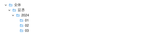 上図のように、「証憑」フォルダの中に年のフォルダ(例:2025)を作り、その中に月のフォルダ(01, 02, 03〜12)を作るとよいです。