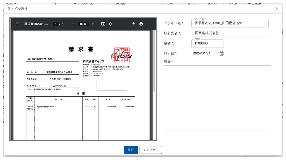 - pdfファイルや画像ファイルである場合は左にプレビューが表示されます。それを見ながら取引先名、金額、取引日を入力します。取引先名は、取引先マスタ登録なしの簡易入力と取引先マスタからの選択の2種類があります。