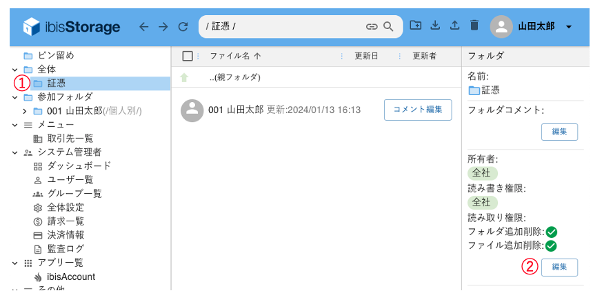 - ②右ペインの「所有者」「読み書き権限」「読み取り権限」の欄の編集ボタンをクリックします。