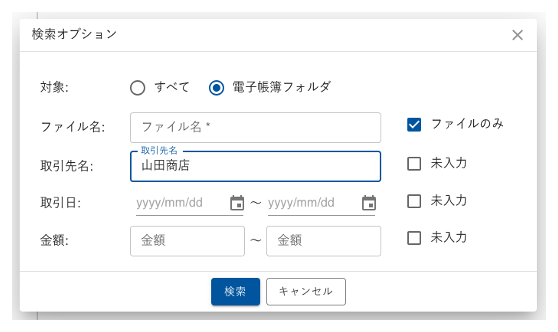 - 取引先名や取引日範囲、金額範囲で検索ができます。