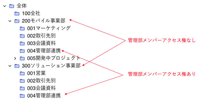 上図のようなフォルダ構成のとき、「モバイル事業部」と「ソリューション事業部」フォルダは管理部グループ所属のユーザーはアクセス権がないとします。そして、その中に「管理部連携」フォルダがあり、そのフォルダには管理部グループに対して読み取り権限以上がある場合は、「管理部連携」フォルダは、管理部グループ所属のユーザーからみたとき参加フォルダとなります。